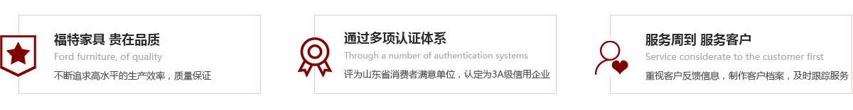 公司全體員工緊緊牢記“福特家具,貴在品質(zhì)”的承諾,本著“以質(zhì)量求生存,以信譽(yù)求發(fā)展”、“誠實(shí)守信”的企業(yè)理念,力爭“創(chuàng)名優(yōu)企業(yè),鑄優(yōu)質(zhì)品牌”,在全公司上下兢兢業(yè)業(yè)、認(rèn)認(rèn)真真,嚴(yán)格要求自己,不斷追求自已,不斷追求更高水平的生產(chǎn)效率,我公司注重質(zhì)量管理,先后通過了國際質(zhì)量管理體系ISO9001認(rèn)證、國際環(huán)境管理體系14001認(rèn)證、職業(yè)健康安全管理體系OHSAS18001認(rèn)證,公司注重品牌建設(shè),先后注冊了“世紀(jì)福特”、“杰福特”、“伯爵”三個(gè)系列商標(biāo),公司連續(xù)多年被煙臺(tái)市工商局授于“市級(jí)守合同重信用企業(yè)”稱號(hào),連續(xù)被山東省工商局授于“省級(jí)守合同重信用企業(yè)”稱號(hào),被山東省企業(yè)信用與社會(huì)責(zé)任協(xié)會(huì)評(píng)為“優(yōu)秀企業(yè)會(huì)員”稱號(hào),連續(xù)被煙臺(tái)市消費(fèi)者協(xié)會(huì)評(píng)為消費(fèi)者滿意單位,連續(xù)被山東省消費(fèi)者協(xié)會(huì)評(píng)為第八屆、第九屆山東省消費(fèi)者滿意單位,被認(rèn)定為AAA級(jí)信用企業(yè),隨著社會(huì)環(huán)保意識(shí)的不斷提高,公司2014年4月順利通過了中國環(huán)境標(biāo)志產(chǎn)品認(rèn)證,2015年8月順利通過了中國質(zhì)量認(rèn)證中心CQC環(huán)保產(chǎn)品認(rèn)證,并于2015年12月被評(píng)為“山東省著名商標(biāo)”榮譽(yù)稱號(hào)。